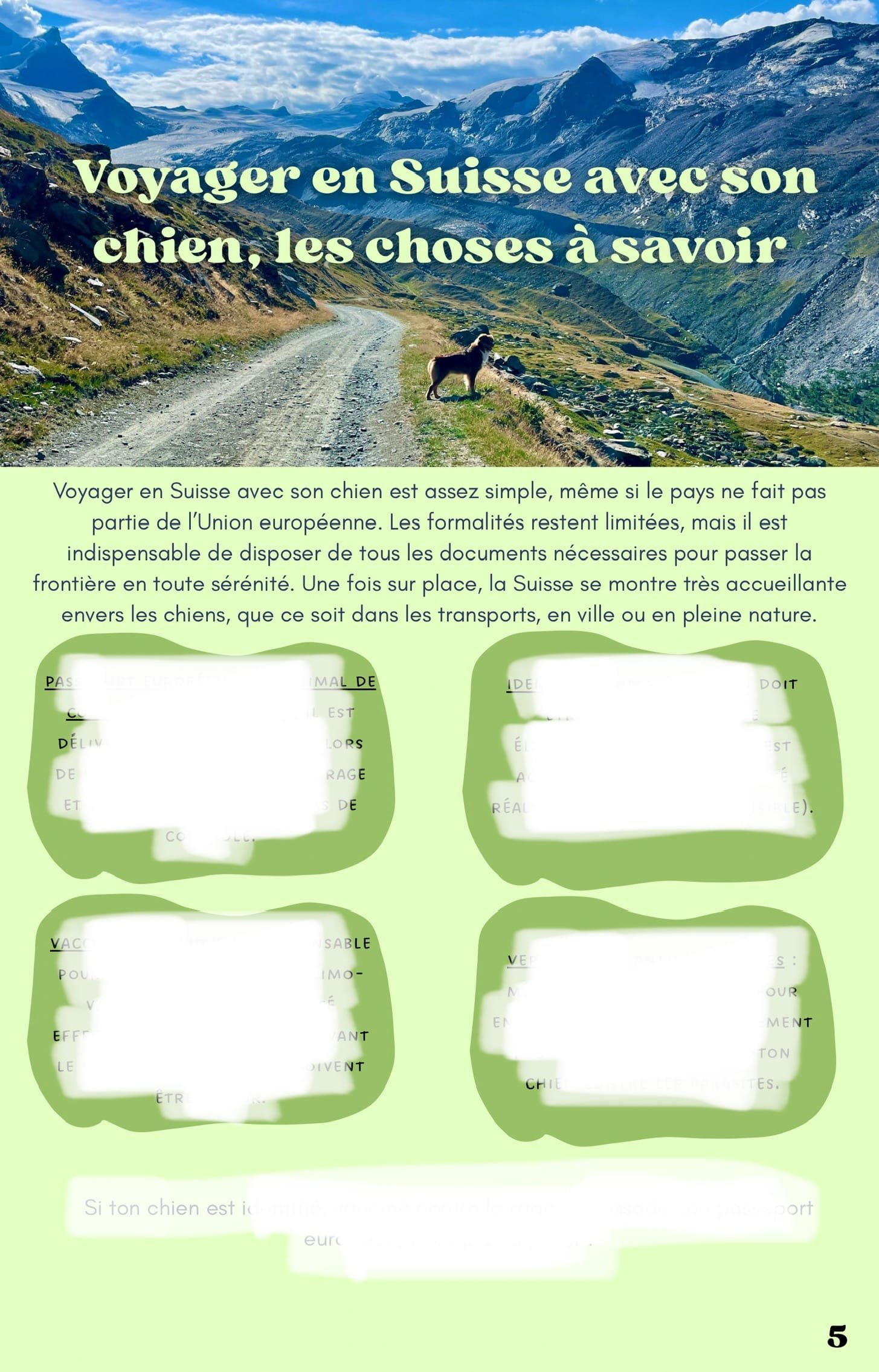 Préparez facilement votre voyage en Suisse avec votre chien grâce à ce guide clair et pratique. En quelques minutes, vous avez toutes les informations essentielles pour organiser un séjour serein : itinéraire, randonnées, hébergements dog friendly, conseils et meilleures adresses testées.
